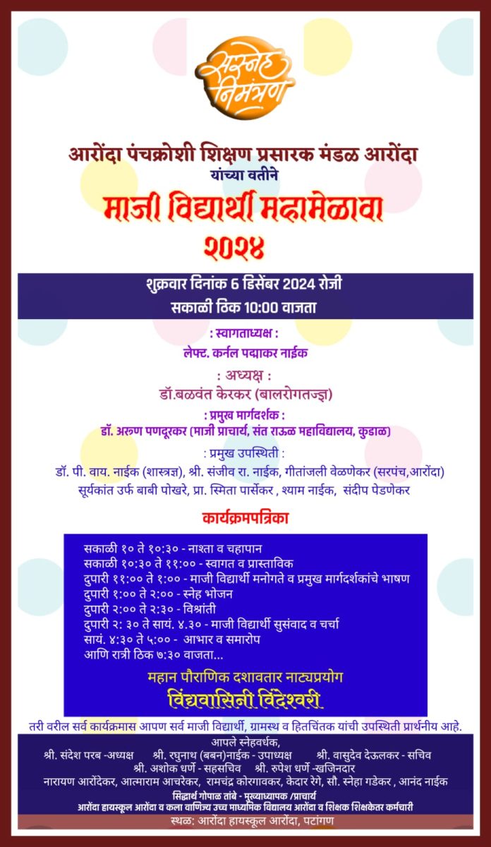 सावंतवाडी : तालुक्यातील आरोंदा पंचक्रोशी शिक्षण प्रसारक मंडळ आरोंदा संचलित, माध्यमिक विद्यालय व उच्च माध्यमिक विद्यालय यांच्या माजी विद्यार्थी सस्नेह महामेळाव्याचे आयोजन ६ डिसेंबर २०२४ रोजी सकाळी दहा वाजता आयोजित केले आहे. यावेळी कार्यक्रमाचे अध्यक्ष म्हणून सुप्रसिद्ध बालरोग तज्ज्ञ डॉ. बळवंत केरकर उपस्थित राहणारअसून स्वागताध्यक्ष लेफ्टनंट कर्नल पद्माकर नाईक असणार आहेत. यावेळी प्रमुख मार्गदर्शक म्हणून संत राऊळ महाविद्यालय कुडाळ येथील माजी प्राचार्य डॉ. अरुण पणदूरकर असणार आहेत.
