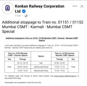 याबाबत कोकण रेल्वेने दिलेल्या माहितीनुसार मुंबई ते गोव्यातील करमळी दरम्यान दररोज चालवण्यात येणाऱ्या विशेष गाडीला सिंधुदुर्ग जिल्ह्यात वैभववाडी आणि सावंतवाडी स्थानकांवर अतिरिक्त थांबे मंजूर केले आहेत. असे जाहीर केले आहेत.