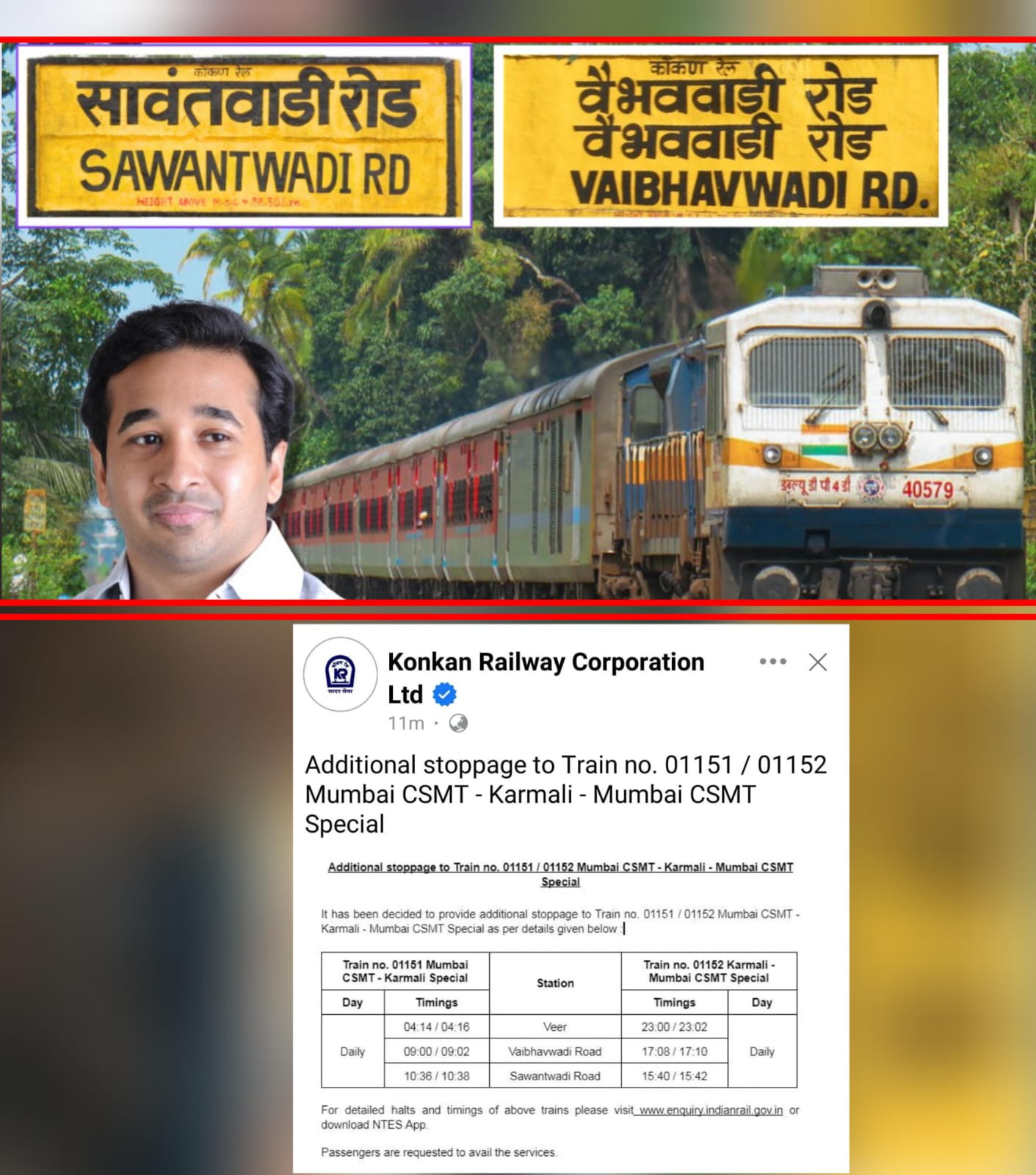 हिवाळी हंगामात सीएसटी ते करमळी अशी गाडी कोकण रेल्वे मार्गावरून धावते या गाडीला सावंतवाडी आणि वैभववाडी या दोन महत्त्वाच्या तालुक्यात थांबा मिळाला असल्यामुळे प्रवाशांमधून समाधान व्यक्त केले जात आहे तसेच आमदार नितेश राणे यांनी हे थांबे मिळावेत म्हणून केलेल्या प्रयत्नाबद्दल जनतेतून आभारही व्यक्त केले जात आहे.