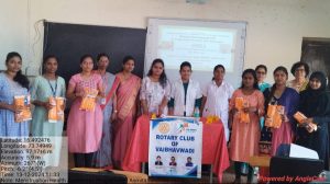 या कार्यक्रमात रोटरी क्लब वैभववाडीच्या वतीने विद्यार्थिनीना सॅनेटरी नॅपकिनचे वाटप करण्यात आले. या कार्यक्रमासाठी रोटरी क्लब वैभववाडीचे अध्यक्ष श्री.प्रशांत गुळेकर, सदस्य श्रीम. संजना रावराणे व श्रीम. स्नेहल खांबल, आरोग्य सेविका श्रीम. जांभवडेकर, प्रभारी प्राचार्य डॉ. एन. व्ही. गवळी, अधीक्षक श्री. संजय रावराणे, महिला विकास कक्षाचे सर्व सदस्य व विद्यार्थिनी उपस्थित होते. या कार्यक्रमाची प्रस्तावना व सूत्रसंचालन प्रा. डॉ. व्ही. सी. काकडे तर आभार प्रदर्शन प्रा. एस. एस. पाटील यांनी केले.