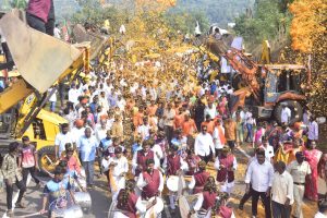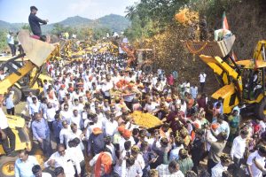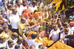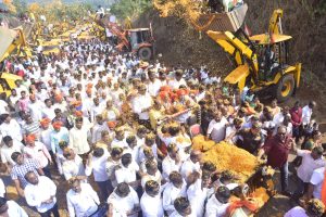 सिंधुदुर्ग जिल्ह्याच्या राजकीय इतिहासात प्रथमच एवढे भव्यदिव्य स्वागत अनुभवण्याचा मान ना.नितेश राणे यांना प्राप्त झाला. खारेपाटण येथे मोठ्या संख्येने कार्यकर्ते आणि नागरिक यांनी सकाळपासुनच हजेरी लावली होती. दोन मोठ्या क्रेनच्या माध्यमातुन भव्य पुष्पहार ठेवण्यात आले होते. पुष्पवृष्टी करण्यासाठी तब्बल ५१ जेसीबी सज्ज झाले होते. मंत्री नितेश राणे यांचे खारेपाटण येथे आगमन झाल्यानंतर जोरदारपणे घोषणाबाजी करत आणि फटाक्यांची आतीषबाजी करत, ढोल पथकांच्या वाद्यावर स्वागत करण्यात आले. यावेळी रथावर स्वार होत मंत्री नितेश राणे हे मुख्य मंचकाच्यादिशेने जात असताना ५१ जेसीबीच्या माध्यमातुन पुष्पवृष्टी करण्यात आल्याने संपुर्ण वातावरण भारावुन गेले होते. एखाद्या राजकीय नेत्याची एवढ्या भव्य-दिव्य पद्धतीने स्वागत होण्याची ही पहिलीच वेळ असल्याच्या प्रतिक्रिया यावेळी व्यक्त करण्यात आल्या.