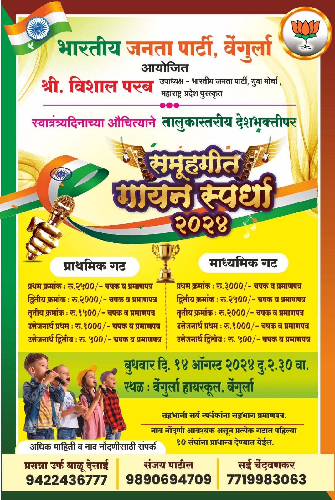 वेंगुर्ल : भारतीय स्वातंत्र्याचा जागर करताना विद्यार्थ्यांच्या तनामनात देशभक्ती सदैव जागृत रहावी यासाठी ‘हर घर तिरंगा’ मोहीमे अंतर्गत भारतीय जनता पार्टी वेंगुर्ला यांच्या वतीने भाजपा युवा मोर्चा महाराष्ट्र प्रदेश उपाध्यक्ष विशाल परब पुरस्कृत स्वतंत्र दिनाच्या पूर्वसंध्येला दिनांक १४ ऑगस्ट २०२४ रोजी दुपारी २.३० वाजता वेंगुर्ला हायस्कूल वेंगुर्ला येथे शालेय देशभक्तीपर समूहगीत गायन स्पर्धेचे आयोजन करण्यात आलेले आहे. सदर स्पर्धा प्राथमिक प्रशाला आणि माध्यमिक प्रशाला अशा दोन गटात होणार असून प्रथम नाव नोंदणी करणाऱ्या फक्त दहा संघांना प्रत्येक गटात प्रवेश दिला जाणार आहे.