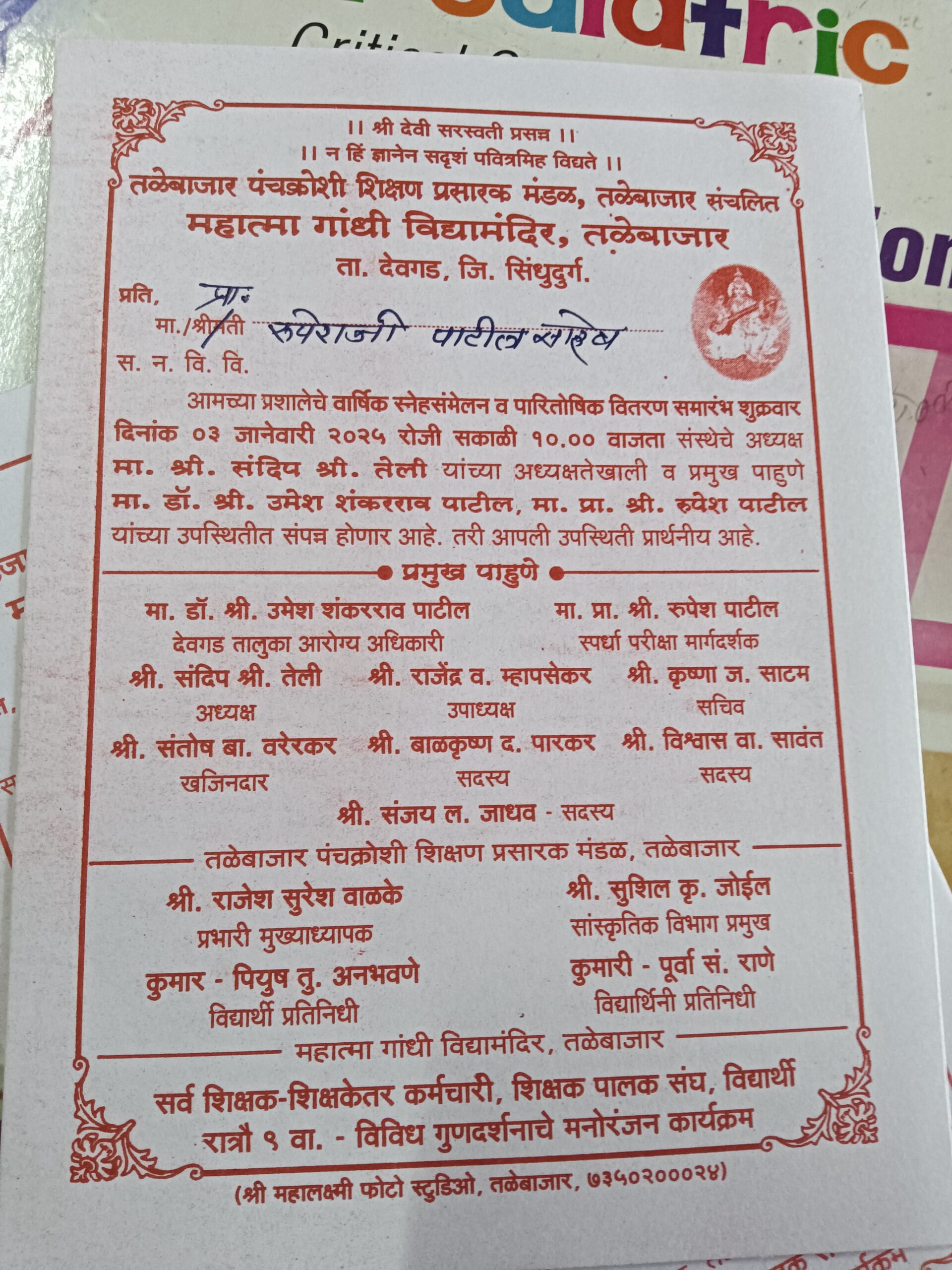 देवगड : तालुक्यातील तळेबाजार पंचक्रोशी शिक्षण प्रसारक मंडळ, तळेबाजार संचलित, महात्मा गांधी विद्यामंदिर, तळेबाजार या प्रशालेचे वार्षिक स्नेहसंमेलन व पारितोषिक वितरण समारंभ उद्या शुक्रवार दिनांक 3 जानेवारी रोजी सकाळी दहा वाजता संस्थेचे अध्यक्ष संदीपशेठ तेली यांच्या अध्यक्षतेखाली संपन्न होणार आहे. यावेळी प्रमुख अतिथी मान्यवर म्हणून डॉ. उमेश शंकरराव पाटील तसेच सुप्रसिद्ध व्याख्याते व स्पर्धा परीक्षा मार्गदर्शक प्रा. रुपेश पाटील उपस्थित राहणार आहेत. तसेच विशेष अतिथी म्हणून संस्थेचे उपाध्यक्ष राजेंद्र म्हापसेकर, सचिव कृष्णा साटम, खजिनदार संतोष वरेरकर, सदस्य बाळकृष्ण पारकर, विश्वास सावंत, संजय जाधव तसेच तळेबाजार पंचक्रोशी शिक्षण प्रसारक मंडळ, तळेबाजार यांचे सर्व सहकारी उपस्थित राहणार आहेत.