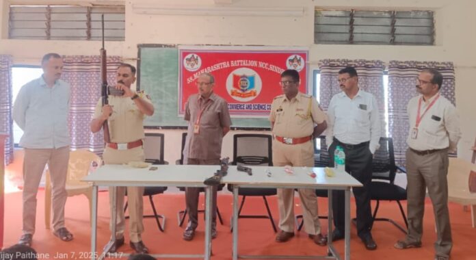 वैभववाडी : महाराष्ट्र पोलीस दलाच्या स्थापनेचे औचित्य साधून दिनांक २ जानेवारी ते ८ जानेवारी दरम्यान पोलीस रेझिंग डे सप्ताह साजरा करण्यात येतो. त्या निमित्ताने वैभववाडी पोलीस स्टेशन ठाणे आणि आनंदीबाई रावराणे महाविद्यालयातील राष्ट्रीय छात्र सेना (एनसीसी) यांच्या संयुक्त विद्यमाने वैभववाडी महविद्यालयात पोलीस रेझिंग डे निमित्त मार्गदर्शन कार्यक्रम संपन्न झाला. वैभववाडी पोलीस स्टेशनचे सहाय्यक पोलीस निरीक्षक सुनील अवसरमोल यांनी पोलिसांच्या वापरात असलेल्या विविध बंदुका, रायफल, अश्रू बॉम्ब अशा विविध शस्त्रास्त्रे यांची माहिती तसेच पोलीस स्टेशनमधील कामकाज, गुन्हे, त्याचा तपास तसेच पोलीस स्टेशनमधील दैनंदिन कामकाजाविषयी सविस्तर माहिती दिली. सर्वांना सर्वतोपरी सुरक्षा पुरवून सगळीकडे शांतता ठेवण्याचे काम पोलीस विभागाकडून केले जाते.