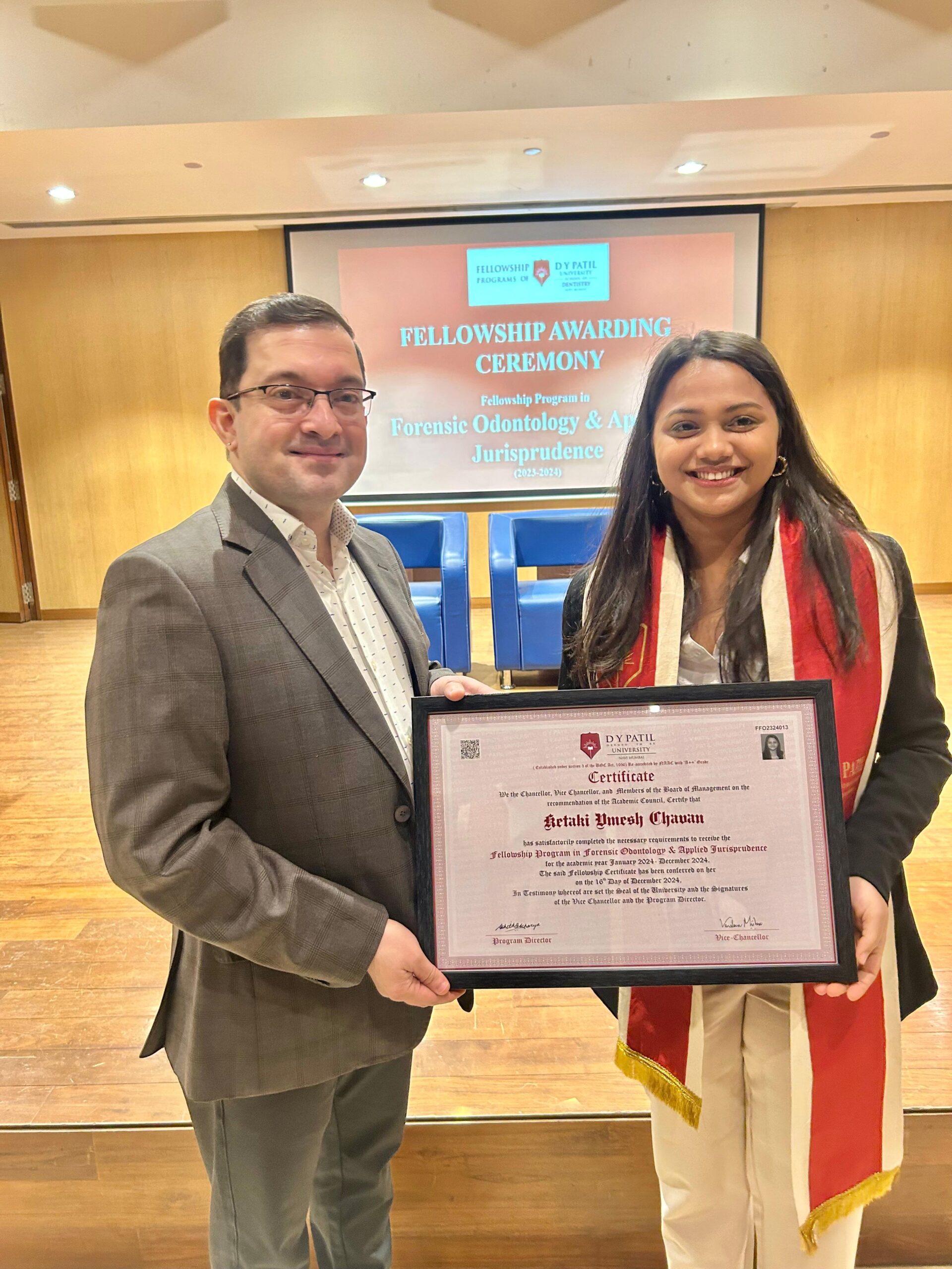 नवी मुंबई : नवी मुंबई येथील डी. वाय. पाटील विद्यापीठाने (जो नॅकद्वारे A++ श्रेणीत पुनः प्रमाणित केले आहे) शैक्षणिक वर्ष जानेवारी 2024 – डिसेंबर 2024 साठी फॉरेन्सिक आडोन्टोलॉजी आणि अनुप्रयुक्त न्यायशास्त्र क्षेत्रातील फेलोशिप प्रोग्राम पूर्ण केलेल्या केतकी उमेश चव्हाण यांना फेलोशिप प्रमाणपत्र प्रदान केले.
