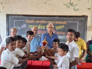 कणकवली : येथील विद्यामंदिर माध्यमिक प्रशालेत राज्य क्रीडा दिन खाशाबा जाधव यांच्या प्रतिमेला पुष्पहार अर्पण करून उत्साहात साजरा करण्यात आला. प्रशालेत वार्षिक क्रीडा महोत्सव घेण्यात आला होता. त्यातील प्रत्येक क्रीडा प्रकारात यशस्वी खेळाडूंचा प्रमाणपत्र व शिल्ड देवून गौरव करण्यात आला. या समारंभाला शिक्षण प्रसारक मंडळाचे अध्यक्ष श्री. तवटे, सचिव श्री. वळंजू, विश्वस्त श्री. डेगवेकर आदि उपस्थित होते.