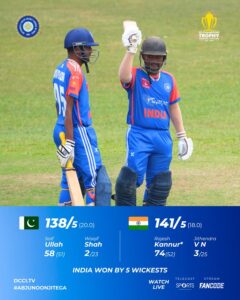 राजेश कन्नूर हा टीम इंडियाच्या विजयाचा शिल्पकार ठरला. राजेशने सलग दुसरं अर्धशतक झळकावलं. राजेशने बुधवारी 15 जानेवारीला श्रीलंकेविरुद्धच्या सामन्यात 60 धावा केल्या होत्या. त्यानंतर आता राजेशने 52 बॉलमध्ये नॉट आऊट 74 रन्स करत टीम इंडियाला विजयी केलं. तर पाकिस्तानकडून वाकिफ शाह याने 23 धावा देत 2 विकेट्स घेतल्या.