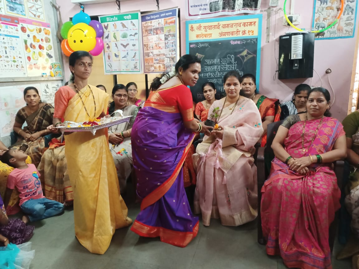यावेळी हळद-कुंकू लावून तुळशीचे रोप सर्व महिलांना अंगणवाडी सेविका अनुराधा पवार यांच्या हस्ते देण्यात आले यावेळी अंगणवाडी मदतनीस अमिषा सासोलकर प्रशालेच्या मुख्याध्यापिका भक्ति फाले , शिक्षिका प्राची ढवळ, पूजा ठाकूर ,भावना गावडे हेमांगी जाधव तसेच पालक महिला सपना विरनोडकर, स्वानंदी नेवगी, राधिका मुंज, भावना किटलेकर,, पूजा साटेलकर नेहा काष्टे आर्या मुंज, तेजस्विनी चव्हाण, संगीता पेडणेकर, पूजा मुंज पूजा गावडे, प्रांजल मेस्त्री, धनश्री पाटील आदी उपस्थित होत्या.