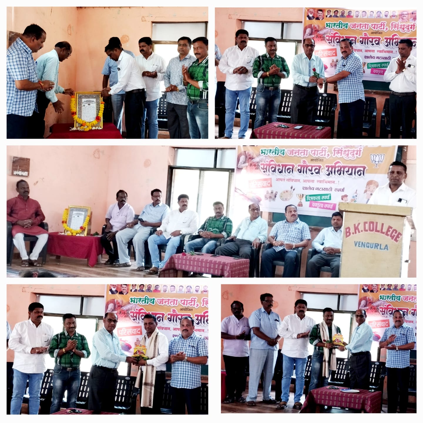 वेंगुर्ला : भारतीय जनता पार्टी , सिंधुदुर्ग यांच्या वतीने बॅरिस्टर बाळासाहेब खर्डेकर महाविद्यालय वेंगुर्ला येथे आयोजित केलेल्या संविधान गौरव यात्रेच्या निमित्ताने परिसंवाद संपन्न झाला. या कार्यक्रमाचे उद्घाटन संविधानाच्या प्रतिमेस पुष्पहार अर्पण करून महाविद्यालयाचे प्राचार्य एम. बी. चौगले यांच्या हस्ते करण्यात आले. यावेळी व्यासपीठावर भाजपाचे जिल्हा उपाध्यक्ष प्रसन्ना उर्फ बाळू देसाई, तालुकाध्यक्ष सुहास गवडळकर , तालुका सरचिटणीस बाबली वांगणकर , मच्छिमार नेते वसंत तांडेल , जिल्हा चिटणीस चंद्रकांत जाधव , माजी नगरसेवीका शीतल आंगचेकर , वक्ते प्रा. वैभव खानोलकर आणि प्रा. व्ही.पी. नंदगिरिकर , कनिष्ठ विभागाचे प्रा.सूर्यवंशी आदी मान्यवर उपस्थित होते.