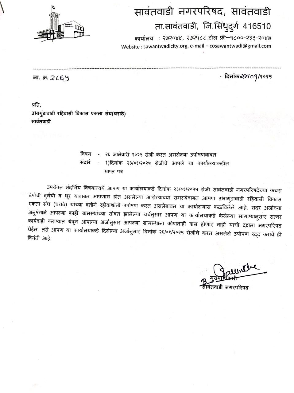 सावंतवाडी नगरपरिषदेच्या कचरा डेपोची दुर्गंधी व धूर याबाबत होत असलेल्या आरोग्याच्या समस्येबाबत उभागुंडावाडी रहिवासी विकास एकता संघ चराठे यांच्यावतीने प्रजासत्ताक दिनी उपोषणाचा इशारा दिला होता. यानंतर नगरपरिषदेत मुख्याधिकारी यांच्याशी चर्चाही झाली होती. यावेळी ग्रामपंचायत सदस्य गौरी सागर गावडे, माजी सदस्य ग्रामपंचायत चराठे अँथोनी डिसोजा, उभागुंडा रहिवासी एकता संघ चराठे सर्व सदस्य व ग्रामस्थ उपस्थितीत होते. त्यानुसार कार्यवाही करण्यात येवून ग्रामस्थांना कोणताही त्रास होणार नाही याची दक्षता नगरपरिषद घेईल असं आश्वासन मुख्याधिकारी सागर साळुंखे यांनी दिल. यामुळे उभागुंडावाडी रहिवासी विकास एकता संघाने आपलं उपोषण तुर्त स्थगित केले आहे.