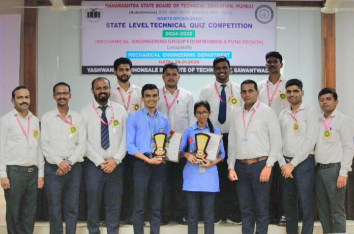 सावंतवाडी : महाराष्ट्र राज्य तंत्रशिक्षण मंडळ पुरस्कृत राज्यस्तरीय टेक्निकल क्विझ कॉम्पिटिशन यशवंतराव भोसले इन्स्टिटयूट ऑफ टेक्नॉलॉजी येथे पार पडली. मेकॅनिकल शाखेच्या विद्यार्थ्यांसाठी आयोजित या स्पर्धेत मुंबई व पुणे विभागातील एकूण अठरा तंत्रनिकेतन संस्था सहभागी झाल्या होत्या. स्पर्धेचे उदघाटन संस्थेचे कार्याध्यक्ष अच्युत सावंतभोसले यांच्या हस्ते करण्यात आले. यावेळी प्राचार्य डॉ.रमण बाणे, उपप्राचार्य गजानन भोसले, शासकीय तंत्रनिकेतन, रत्नागिरीचे अधिव्याख्याता व परीक्षक अमोल धांडे, सचिन लांजेकर, मेकॅनिकल विभागप्रमुख अभिषेक राणे उपस्थित होते.