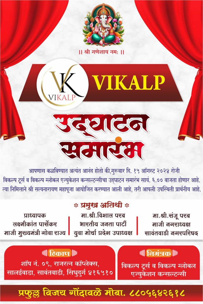 या शुभारंभ प्रसंगी श्री सत्यनारायण महापूजा आयोजित केली आहे. तरी सावंतवाडीकर नागरिक व मित्रपरिवार यांनी उपस्थित राहून कार्यक्रमाची शोभा वाढवावी, असे आवाहन संचालक प्रफुल्ल विजय गोंदावळे आणि विकल्प टूर्स व विकल्प ग्लोबल एज्युकेशन कन्सल्टन्सी टीमने केले आहे.