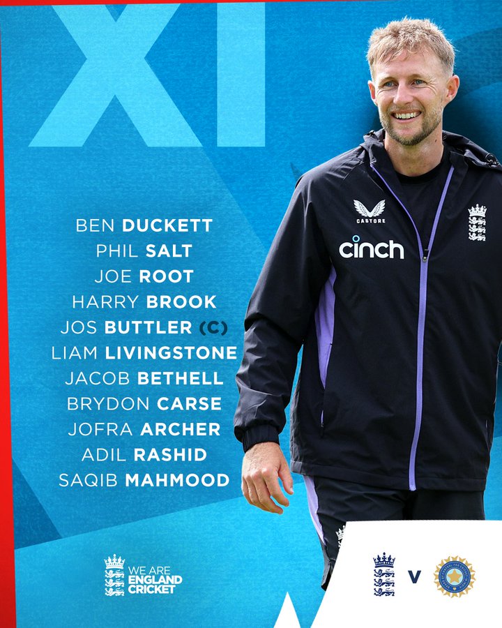 इंग्लंड प्लेइंग ईलेव्हन : जोस बटलर (कर्णधार), बेन डकेट, फिलिप सॉल्ट (विकेटकीपर), जो रूट, हॅरी ब्रूक, लियाम लिव्हिंगस्टोन, जेकब बेथेल, ब्रायडन कार्स, जोफ्रा आर्चर, आदिल रशीद आणि साकिब महमूद.