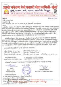 निवेदनावर अध्यक्ष श्री.शेखर बागवे व सेक्रेटरी श्री.यशवंत जडयार यांनी सह्या केल्या असून त्याच्या प्रति कोकण रेल्वेचे व्यवस्थापकीय संचालक श्री.संतोषकुमार झा,जनरल मॅनेजर : पश्चिम रेल्वे,खासदार श्री.सुनिल तटकरे,खासदार श्री.नारायण राणे व खासदार श्री.हेमंत सावरा यांना पाठवल्या आहेत.